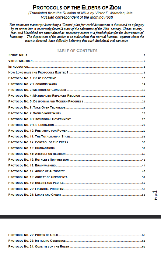 The last image, is the contents page of the conspiracy propaganda called The Protocols of the Elders of Zion, which was heavily promoted by the Nazis as justification for their actions, its also just for perspective, I’m not trying to promote any of these ideas as legitimate - only that they present a disturbing foil to what’s already going on right now - evil preys on naivety.